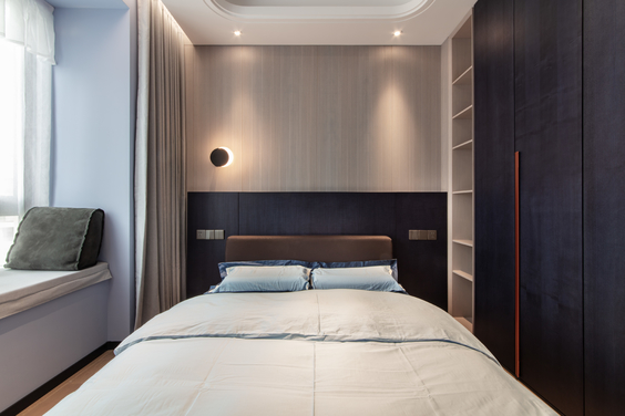 主卧入口融合在墙板中,一门到顶大气美观。进入空间一面是收纳展示于一体的衣柜,另一边是整装墙板结构,不仅仅延续了整个空间立体的质感,搭配同样来自意大利 B&B 的 1.8 米舒适软包大床,让一整天疲惫都可以放松下来。躺在床上同样可以将西山收入眼底。主卧内设两处衣帽间,满足夫妻二人的收纳需求。