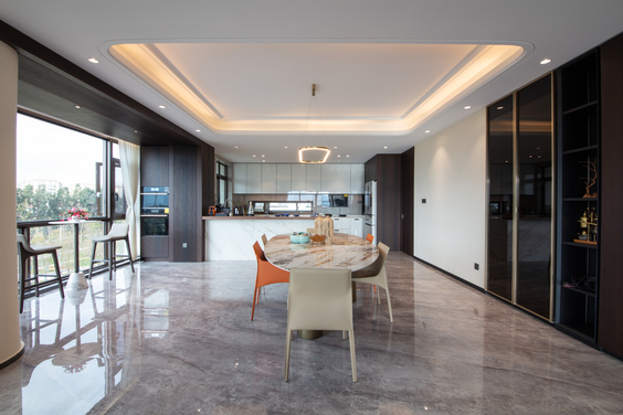 餐厅圆桌与室内承重圆柱呼应。意大利的贝克斯特(Baxter)原装进口的 LAGOS 大理石餐桌,不仅仅是家具更是一件艺术收藏品,配上同样来自意大利的(Poliform)SEATTLE 系列的手工皮椅完美兼顾人体力学带来的极致舒适感。原来凹进去的地方做了一个酒柜,玻璃双开门的设置,联通顶到地面,优雅又富有格调,内藏照明灯带,也让主人心仪的摆件有了展示的地方。靠窗早餐台截断了长廊阳台,扩大了餐厅使用空间。品一壶茶,尝一杯咖啡,眺望远方发发呆。